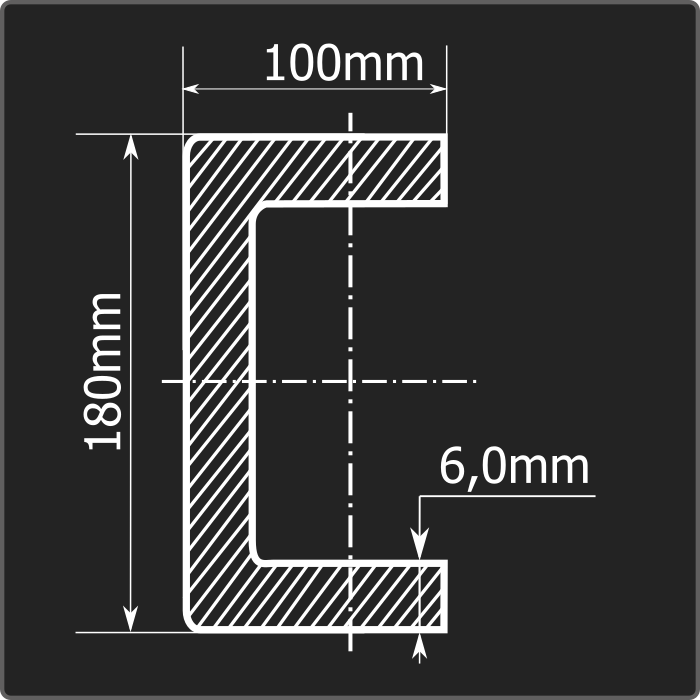 Швеллер стальной холоднокатаный гнутый равнополочный 180*100мм, толщиной 6,0мм и длиной 12м. Материал - углеродистая сталь. Соответствует требованиям ГОСТ 8278-83.