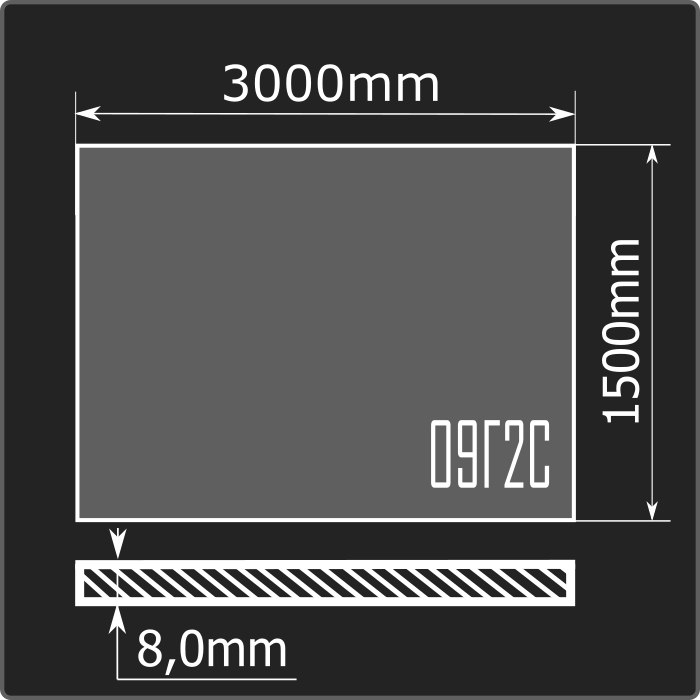 Лист стальной горячекатаный толщиной 8,0мм, шириной 1500мм и длиной 3000мм. Материал - низколегированная сталь. Соответствует требованиям ГОСТ 19281-2014.
