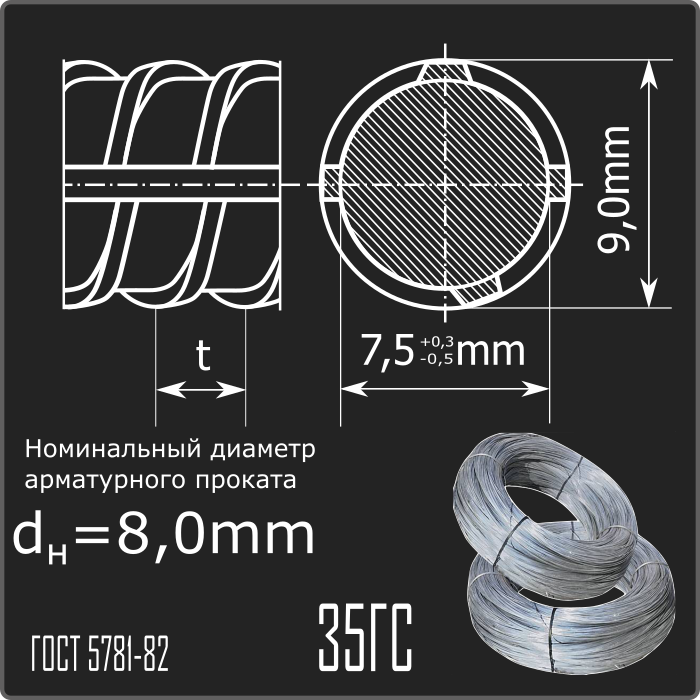Арматурный прокат горячекатаный в мотках периодического профиля номинального диаметра dн 8,0мм класса 35ГС.  Соответствует требованиям ГОСТ 5781-82.