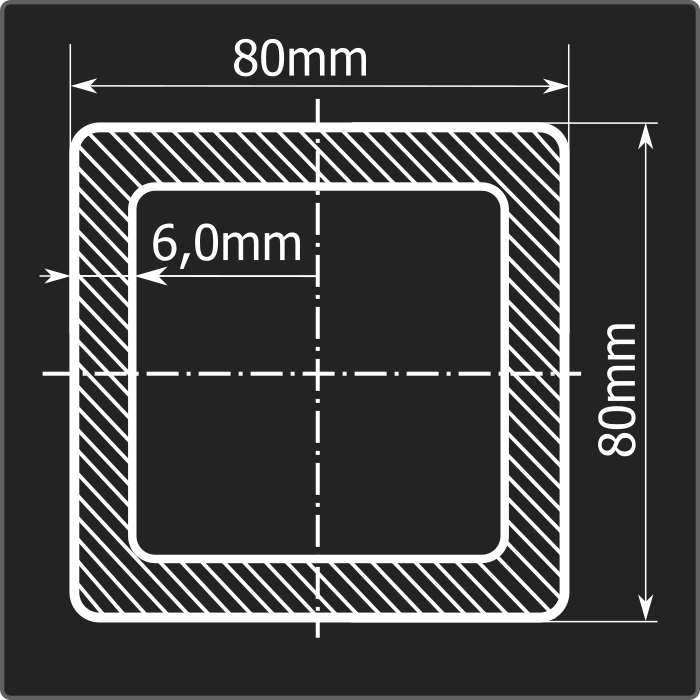 Труба профильная стальная квадратного сечения 80*80мм, длиной 12м и толщиной 6,0мм. Стыковая. Материал - углеродистая сталь. Соответствует требованиям ГОСТ 13663-86.