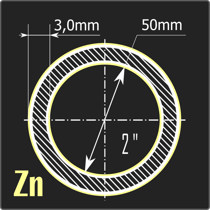 Труба стальная водогазопроводная оцинкованная внутренним диаметром 50мм, толщиной 3,0мм и длиной 6м. Тип покрытия – горячее цинкование ГОСТ 9.307-89. Материал - углеродистая сталь. Соответствует требованиям ГОСТ 3262-75.